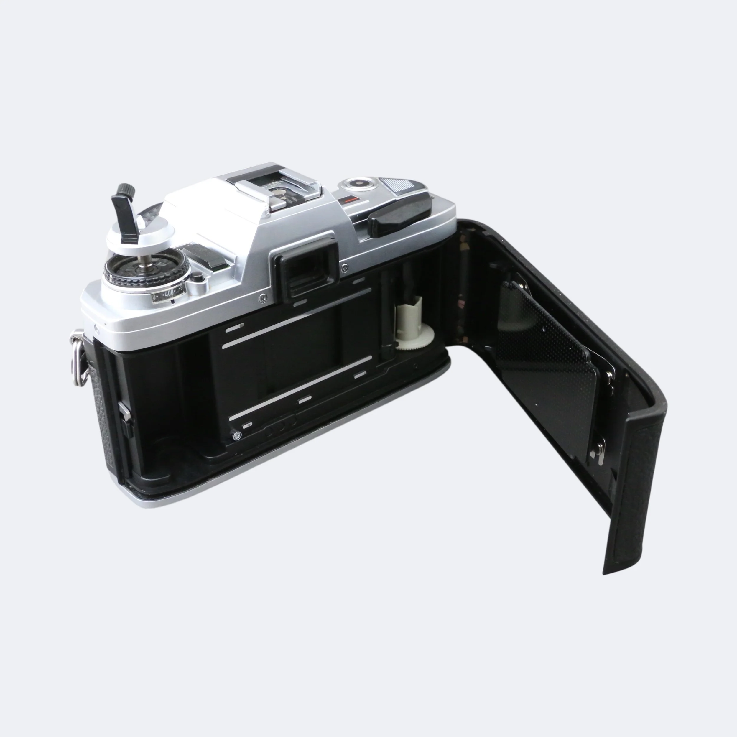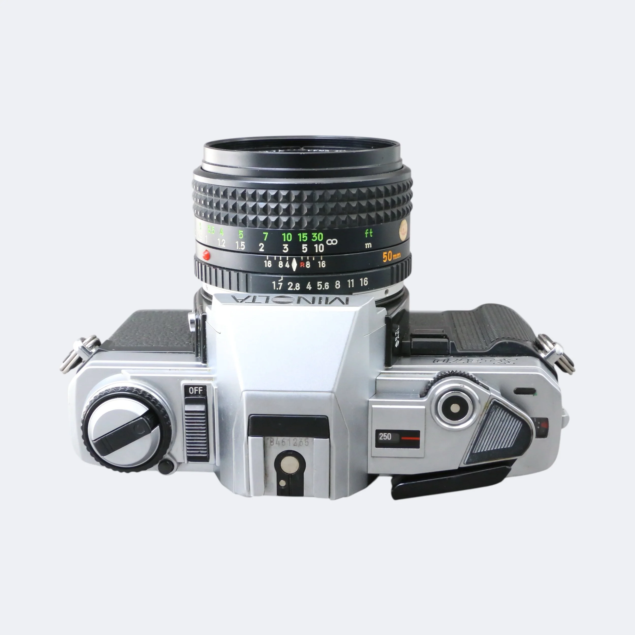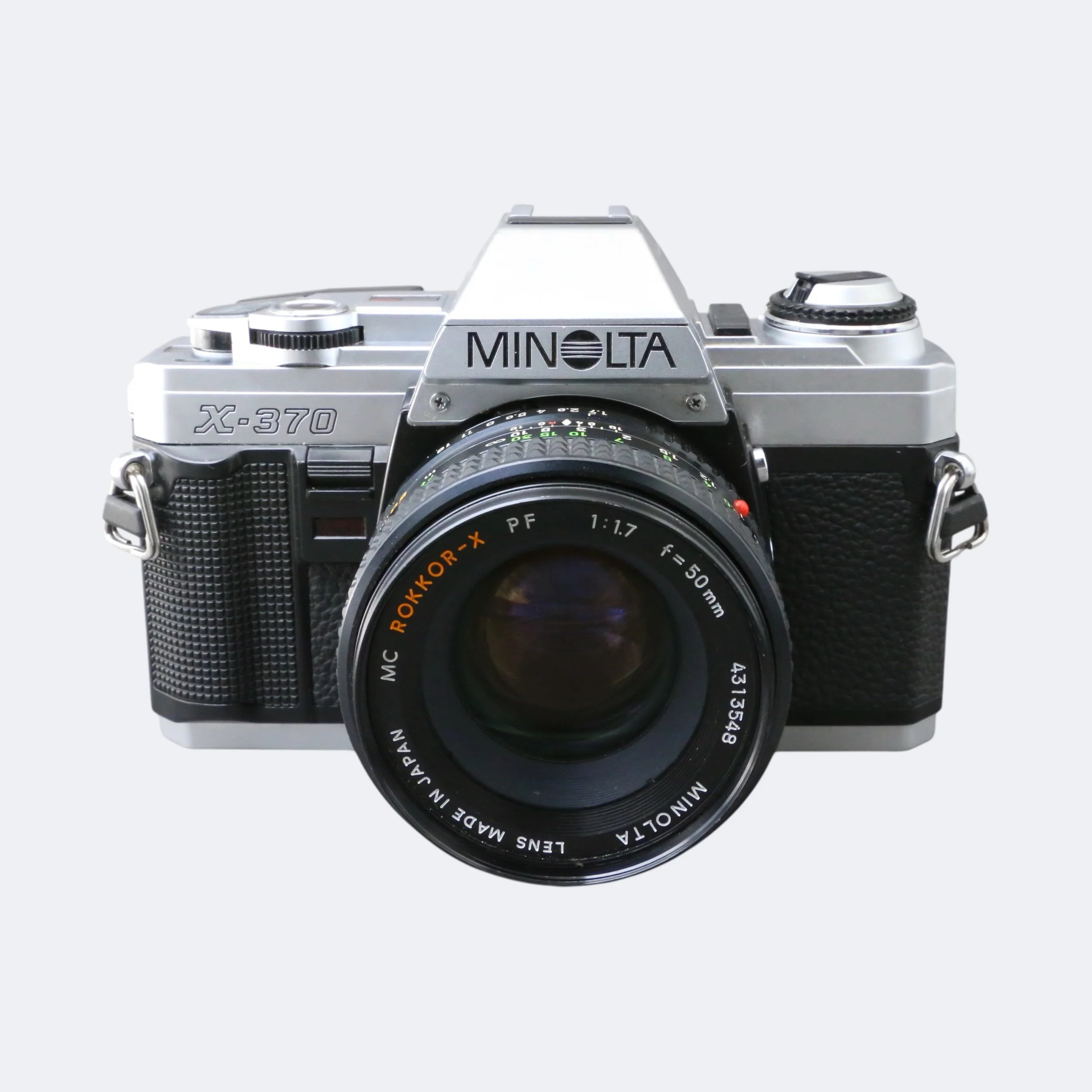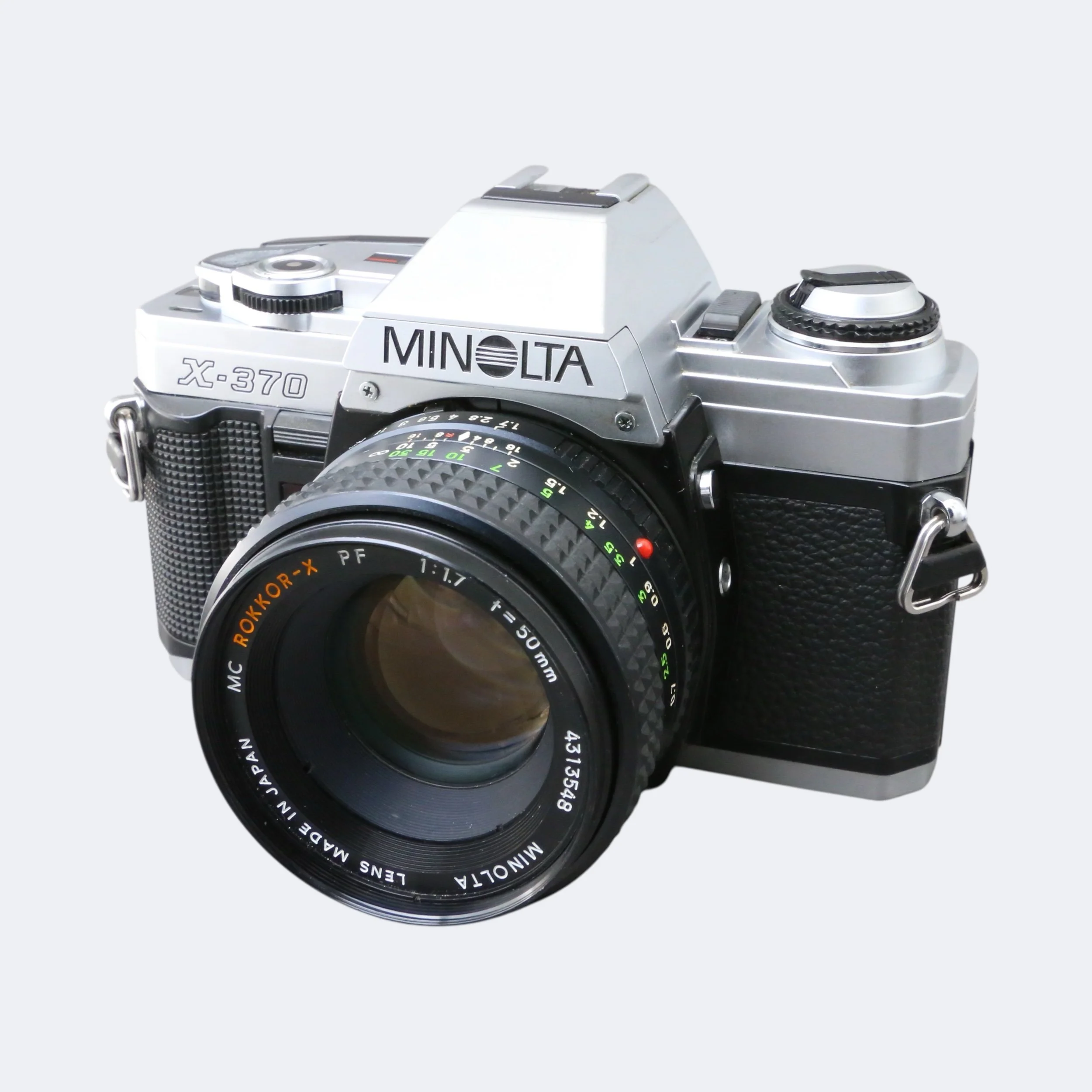 A classic and highly regarded manual-focus SLR from the 1980s, the Minolta X-370 offers a bright viewfinder, intuitive controls, and reliable electronic shutter performance. Paired with the sharp Rokkor-X 50mm f/1.7, this setup is excellent for portraits, low-light shooting, and students learning manual exposure.