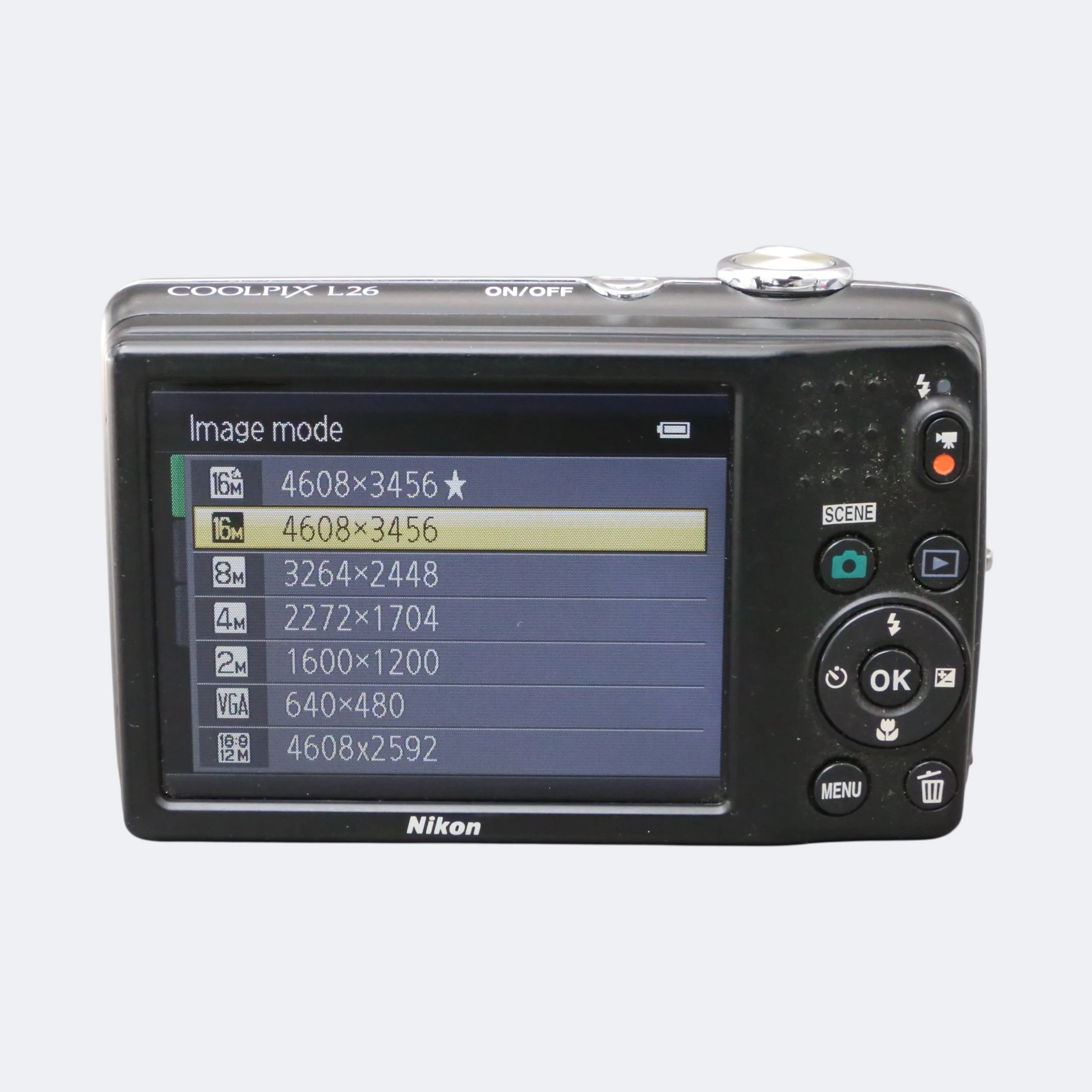COMPACT EARLY-2010S POINT-AND-SHOOT DESIGNED FOR SIMPLE, RELIABLE EVERYDAY PHOTOGRAPHY. THE COOLPIX L26 FEATURES A HIGH-RESOLUTION CCD SENSOR, EASY AUTO SHOOTING MODES, AND A VERSATILE NIKKOR ZOOM LENS IN A LIGHTWEIGHT BODY — GREAT FOR TRAVEL, DAILY USE, OR THE CLASSIC DIGICAM LOOK.