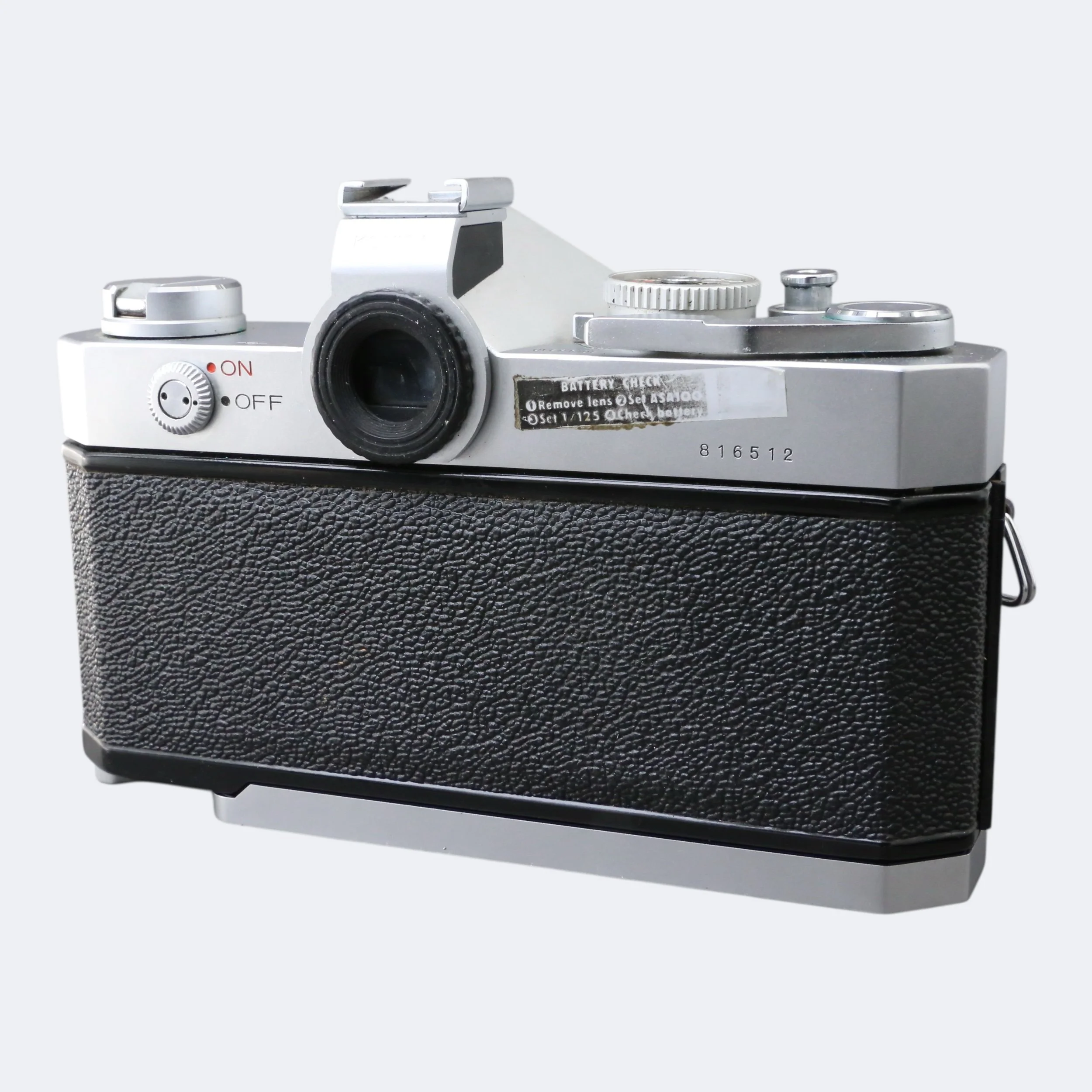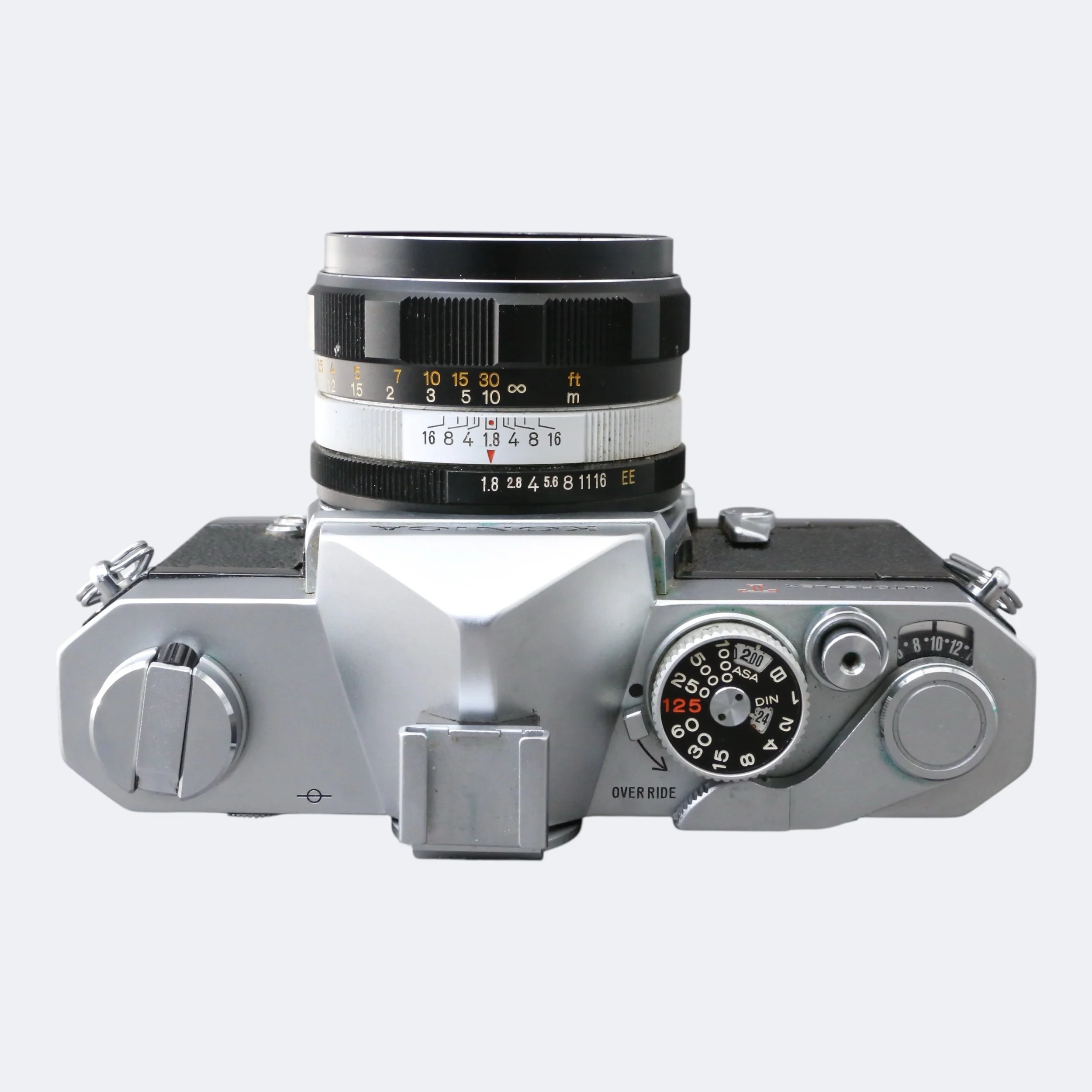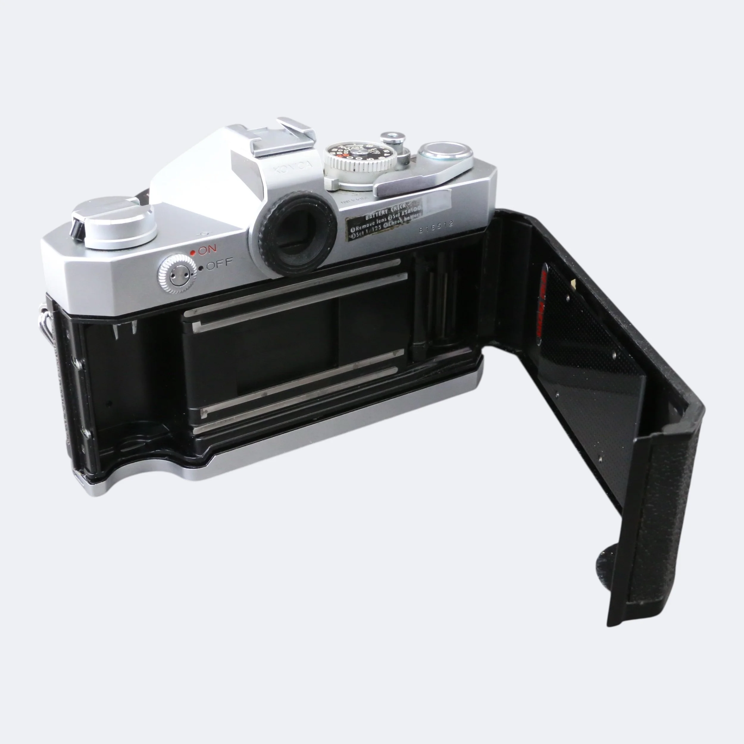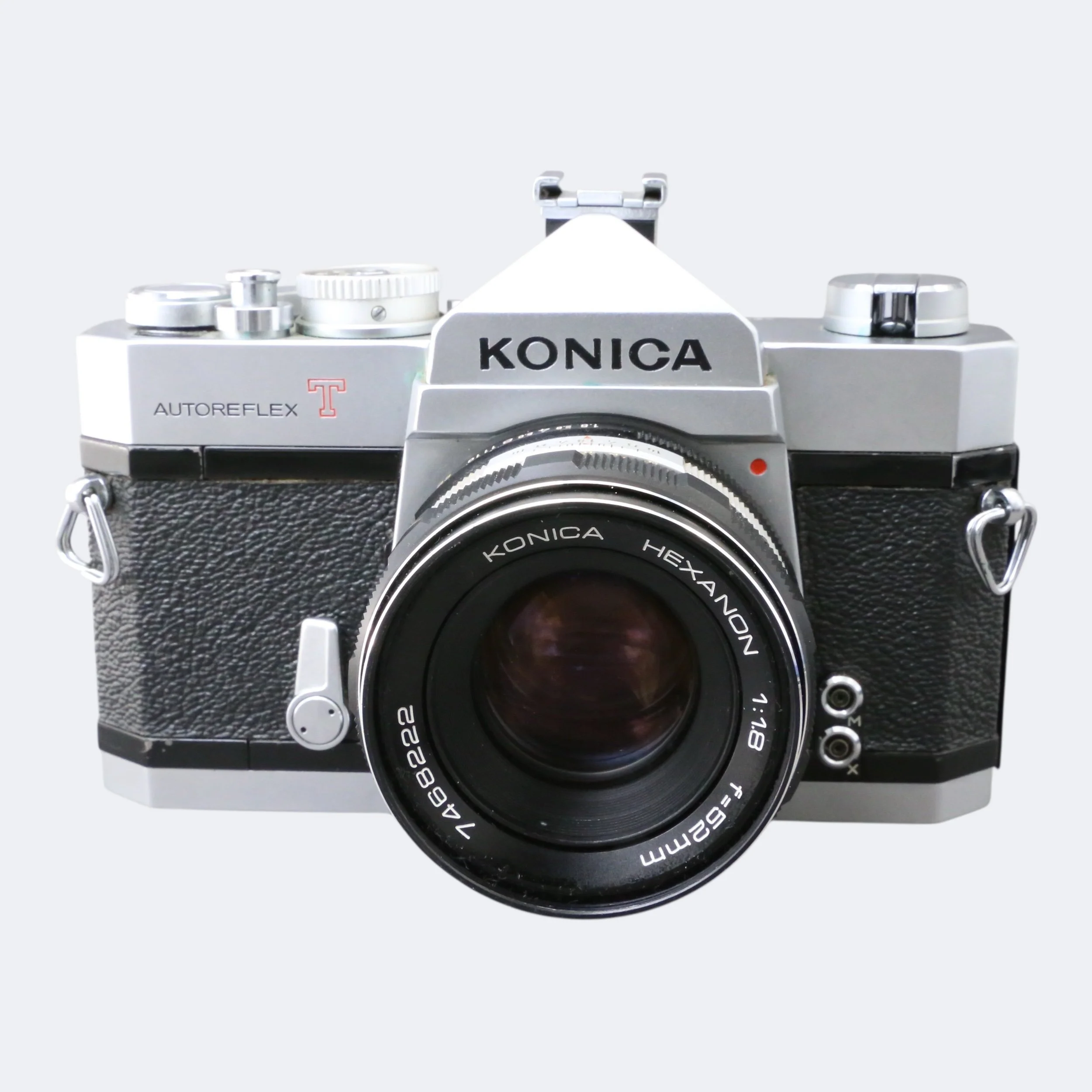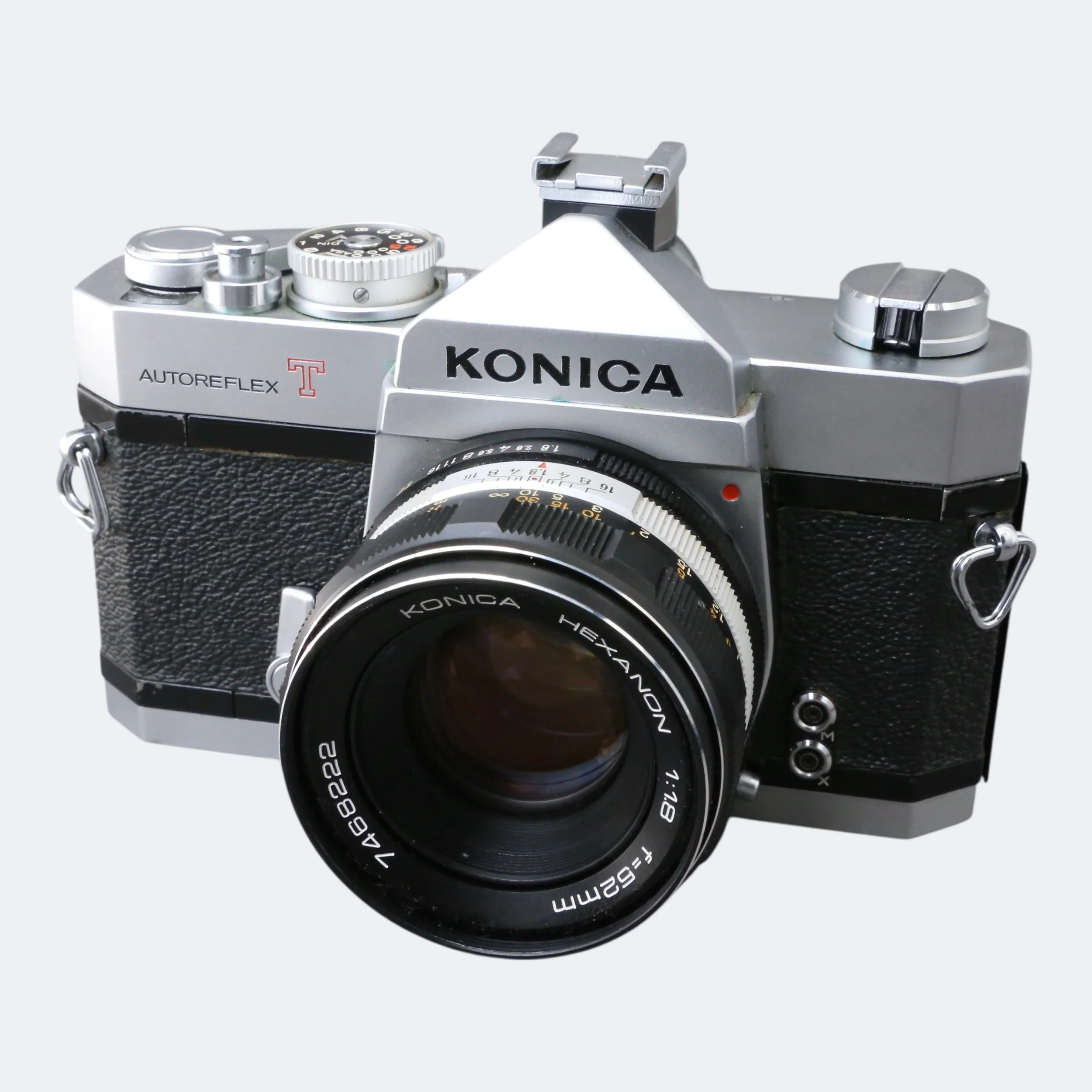 A highly regarded professional SLR from the late 1960s–early 1970s, the Konica AutoReflex T is famous for its rugged all-metal construction and unique switchable half-frame / full-frame shooting. Paired with the sharp Konica 52mm f/1.8 Hexanon lens, this setup is excellent for portraits, street photography, and classic manual shooting.