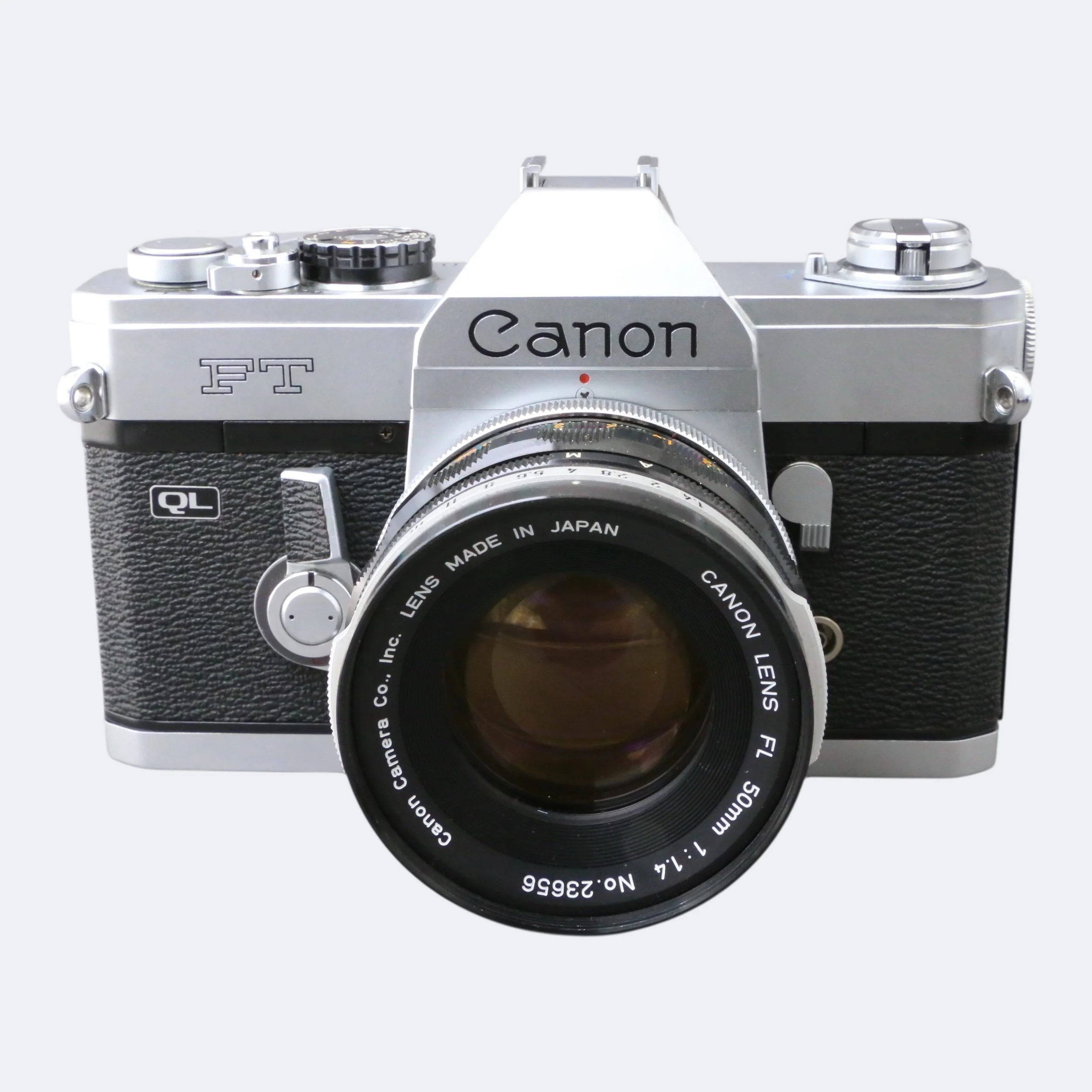 A rugged, all-mechanical SLR from the mid-1960s, the Canon FT is known for its tank-like build quality and fully manual operation. Paired with the Canon FL 50mm f/1.8, this setup is excellent for learning classic exposure techniques, portraits, and everyday 35mm film photography.