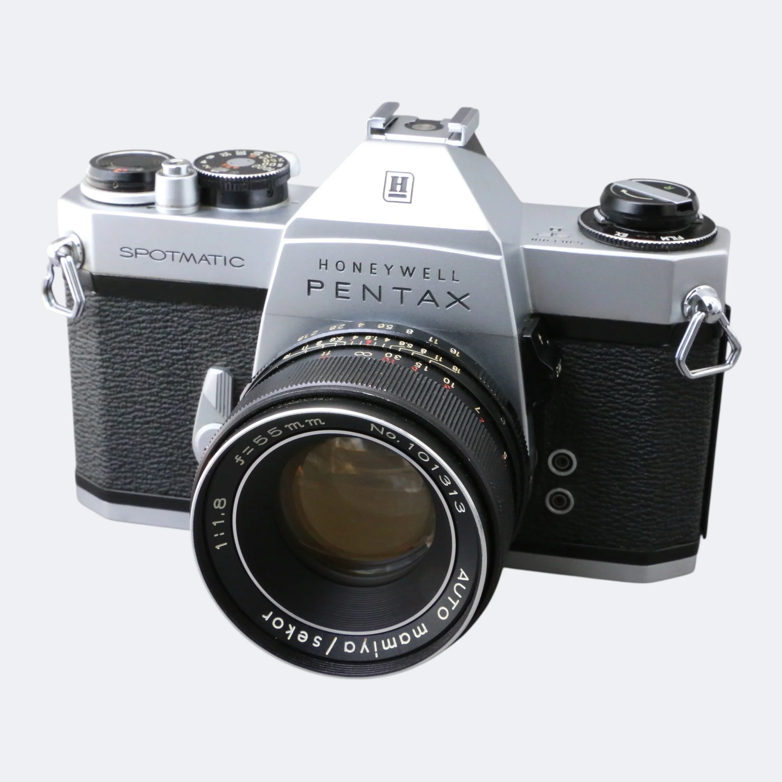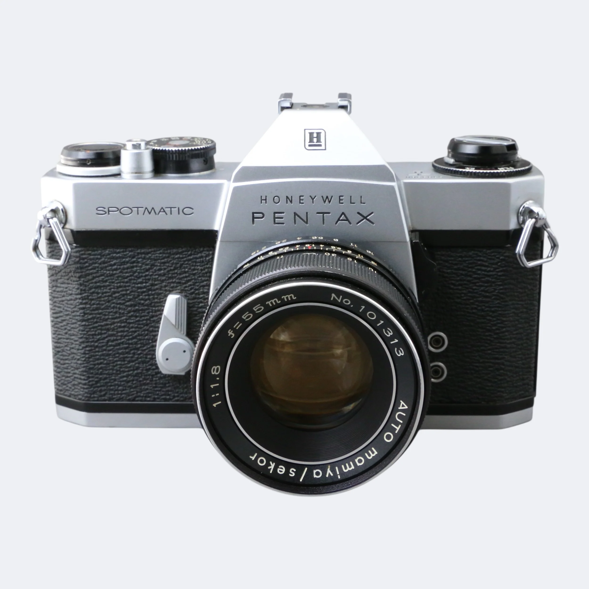 A classic mechanical SLR from the 1960s, the Honeywell Pentax Spotmatic is renowned for its reliability, excellent build quality, and iconic M42 screw-mount system. Paired with the fast Mamiya Sekor 55mm f/1.8, this setup is ideal for portraits, street photography, and learning full manual exposure.