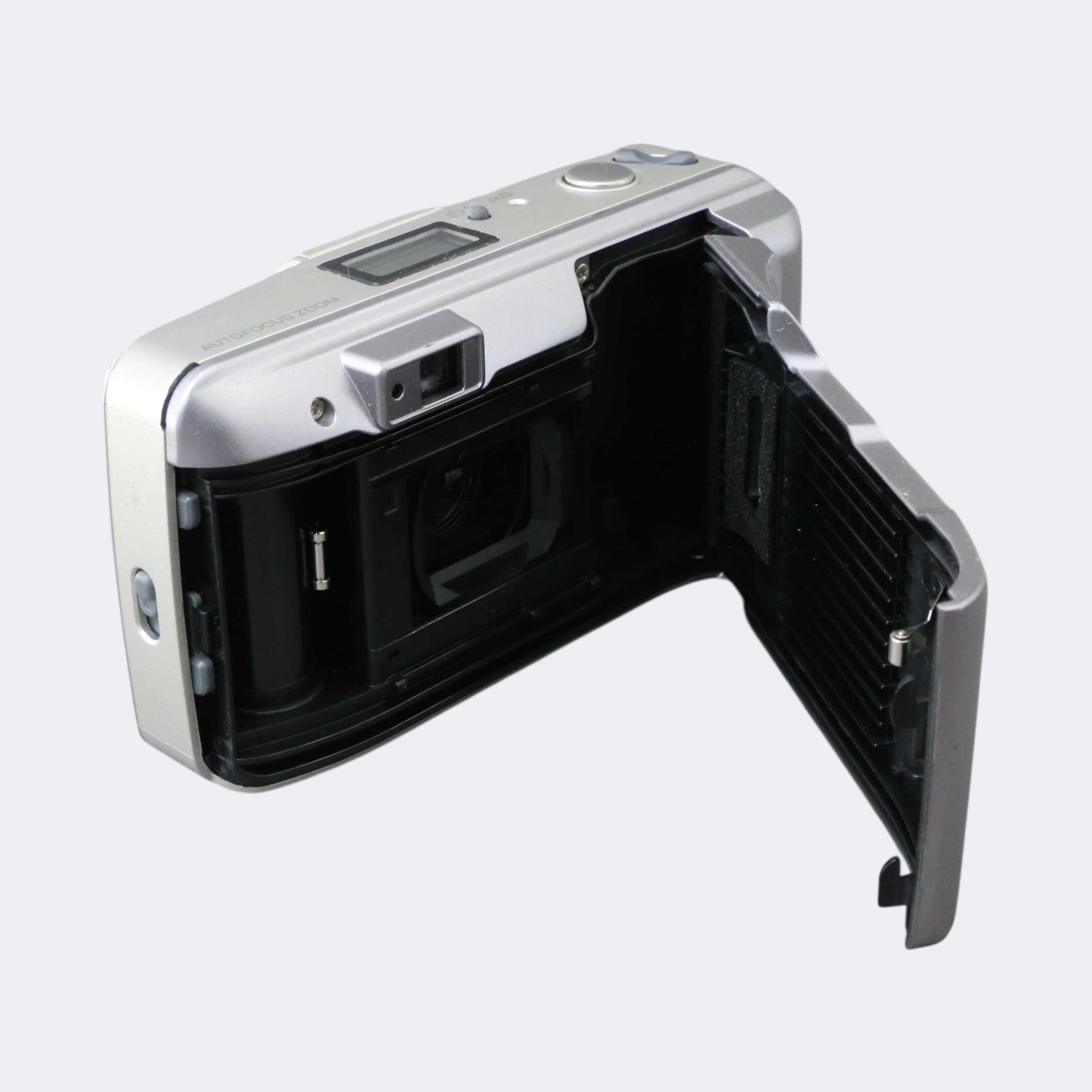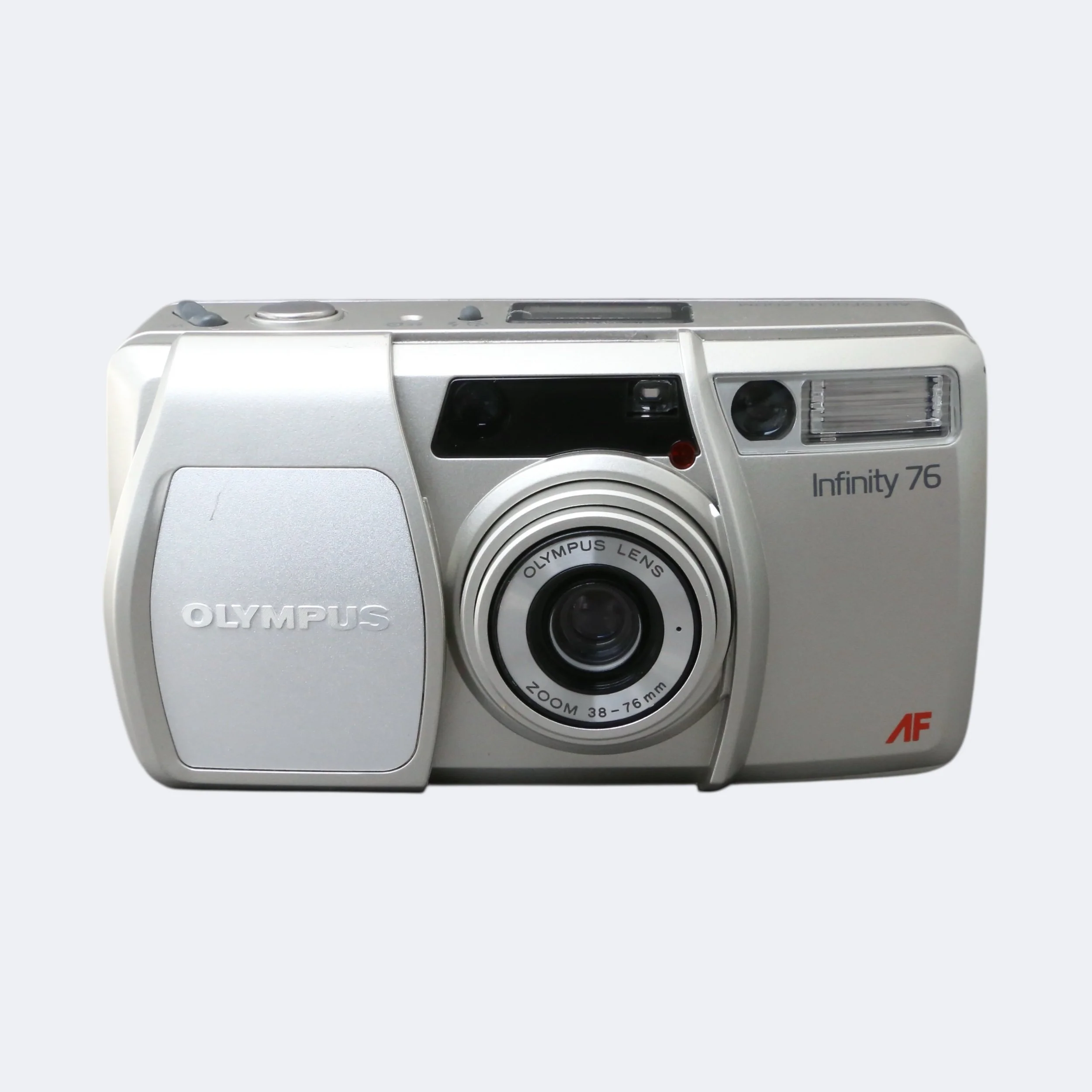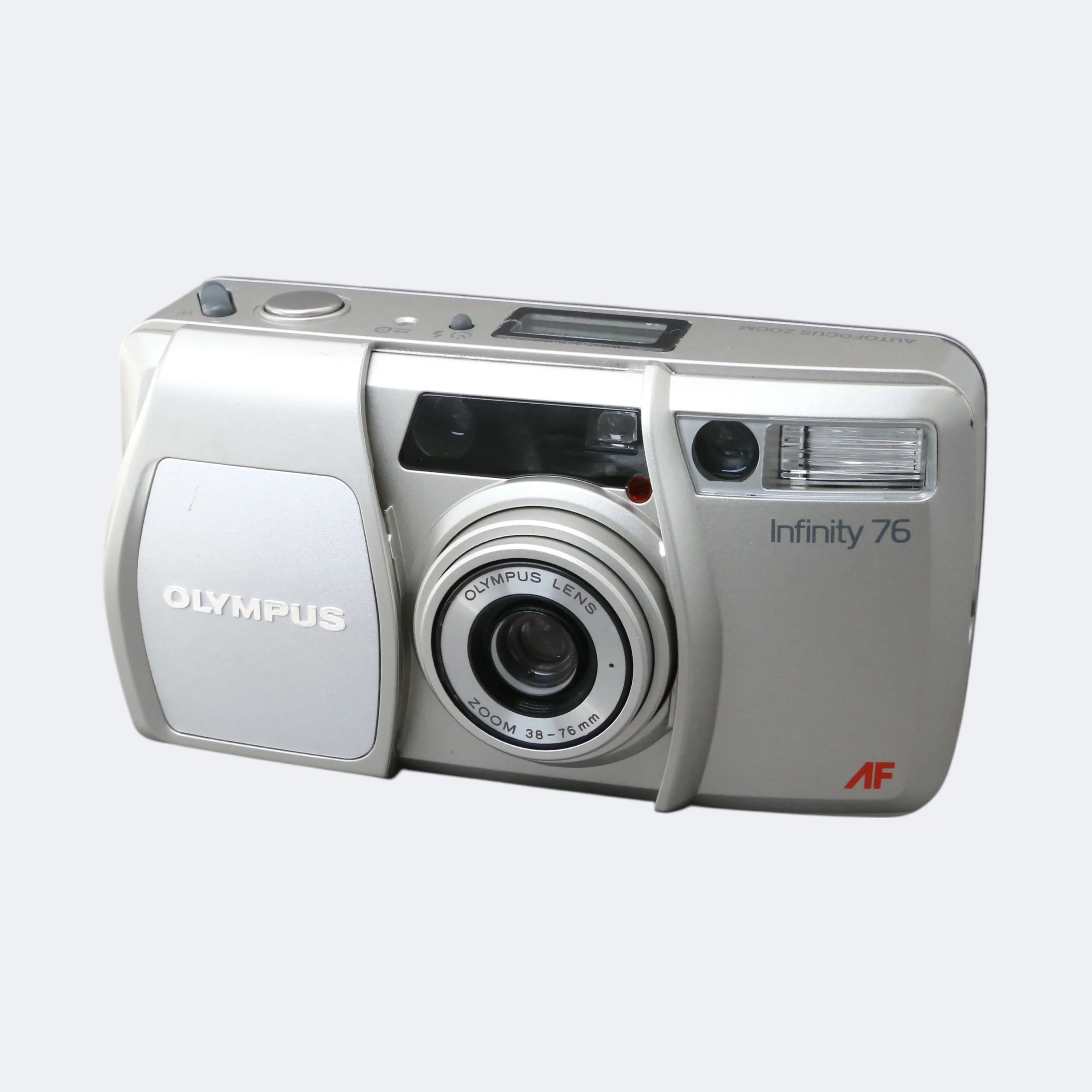 A compact mid-1990s point-and-shoot, the Olympus Infinity 76 (also known as the Infinity Stylus Zoom 76 in some regions) offers reliable autofocus, a versatile zoom lens, and the classic weather-resistant Olympus clamshell design. Simple, durable, and great for everyday film shooting.