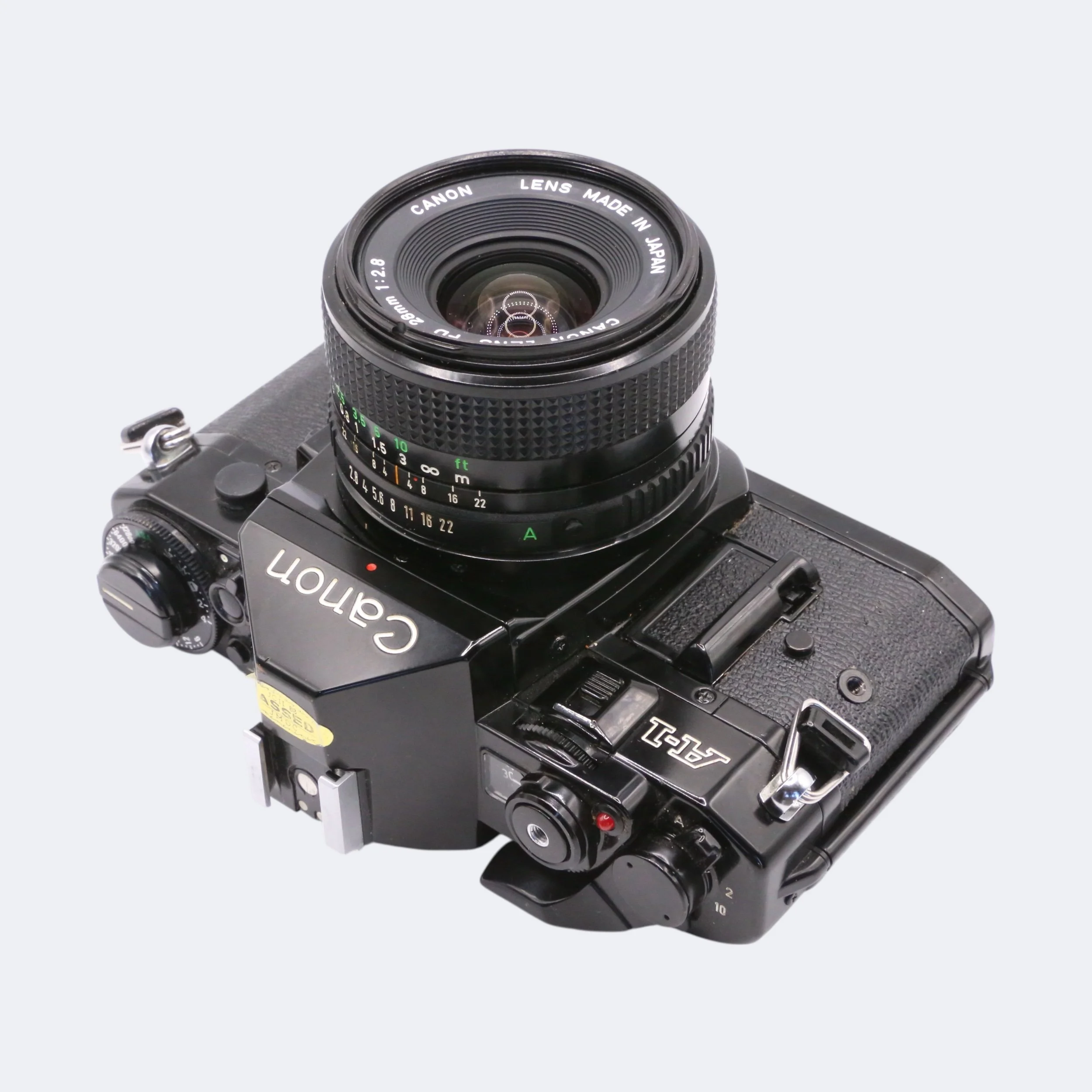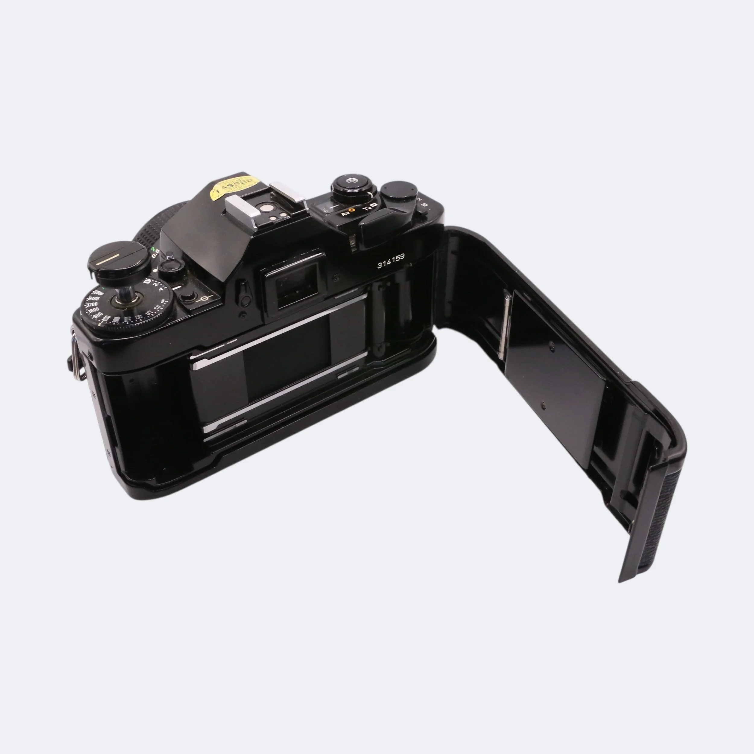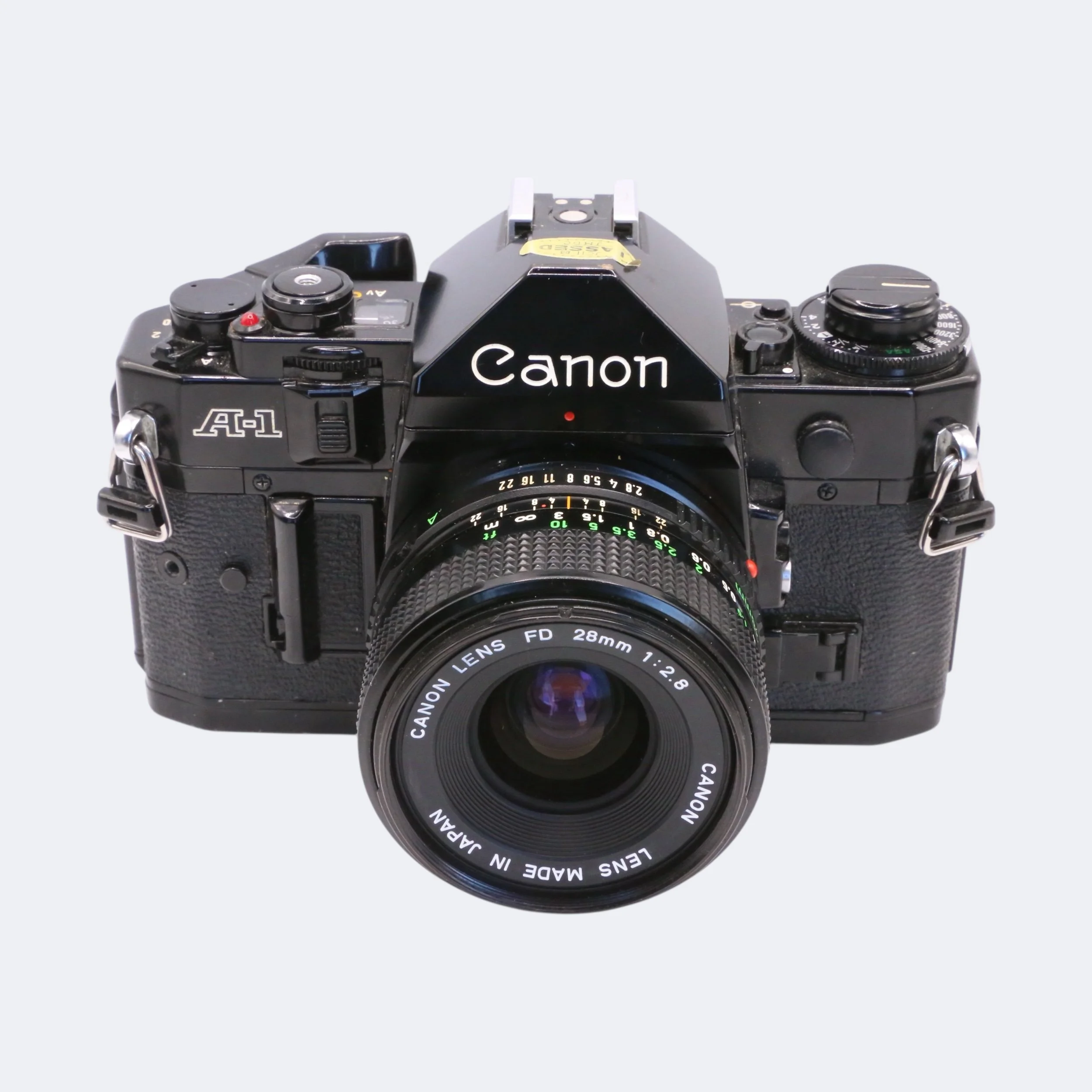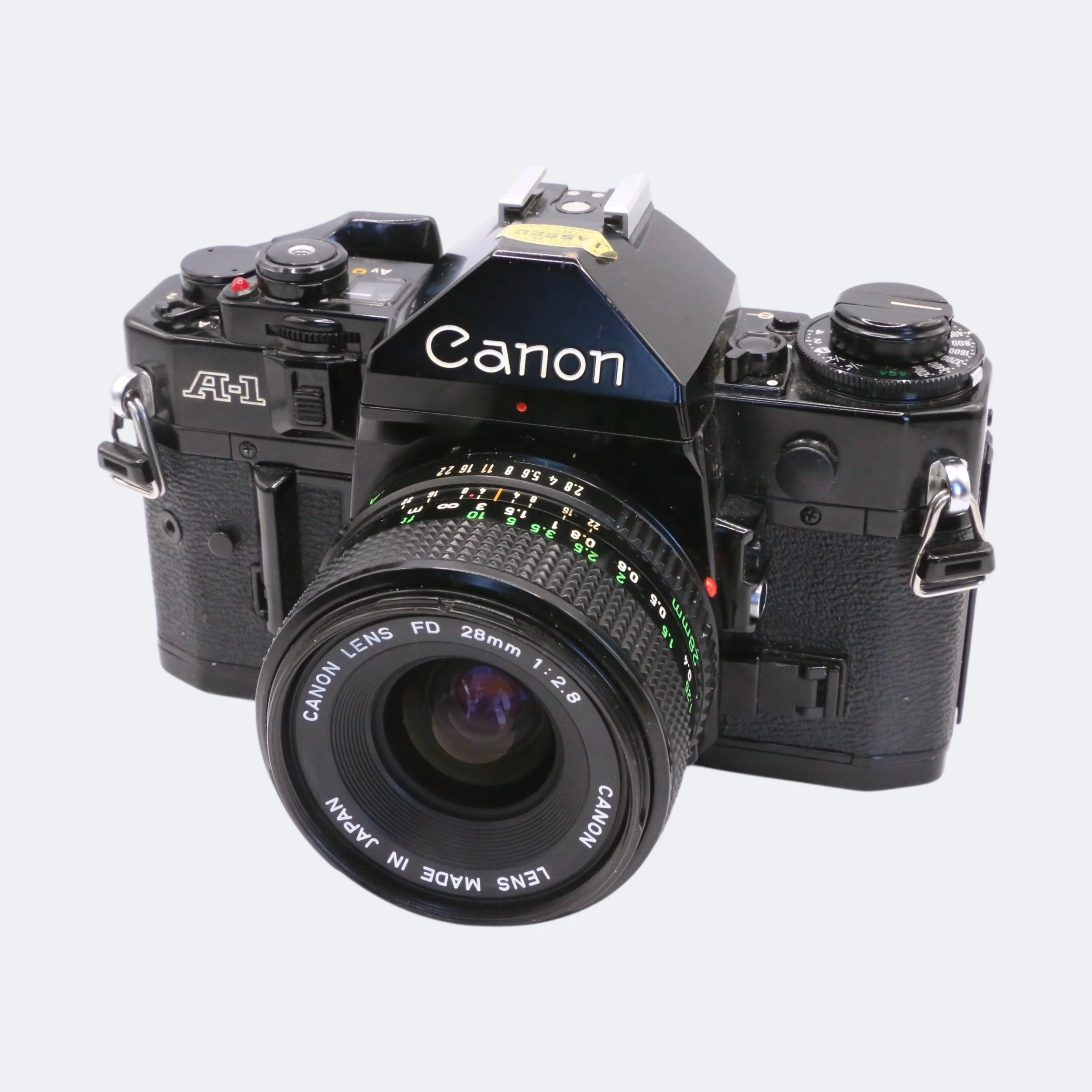 A professional-grade SLR from the late 1970s, the Canon A-1 was one of the first cameras to offer full program auto exposure alongside manual, shutter-, and aperture-priority modes. Built to last with precise controls and bright metering, it remains a favorite among film enthusiasts for both usability and classic design.