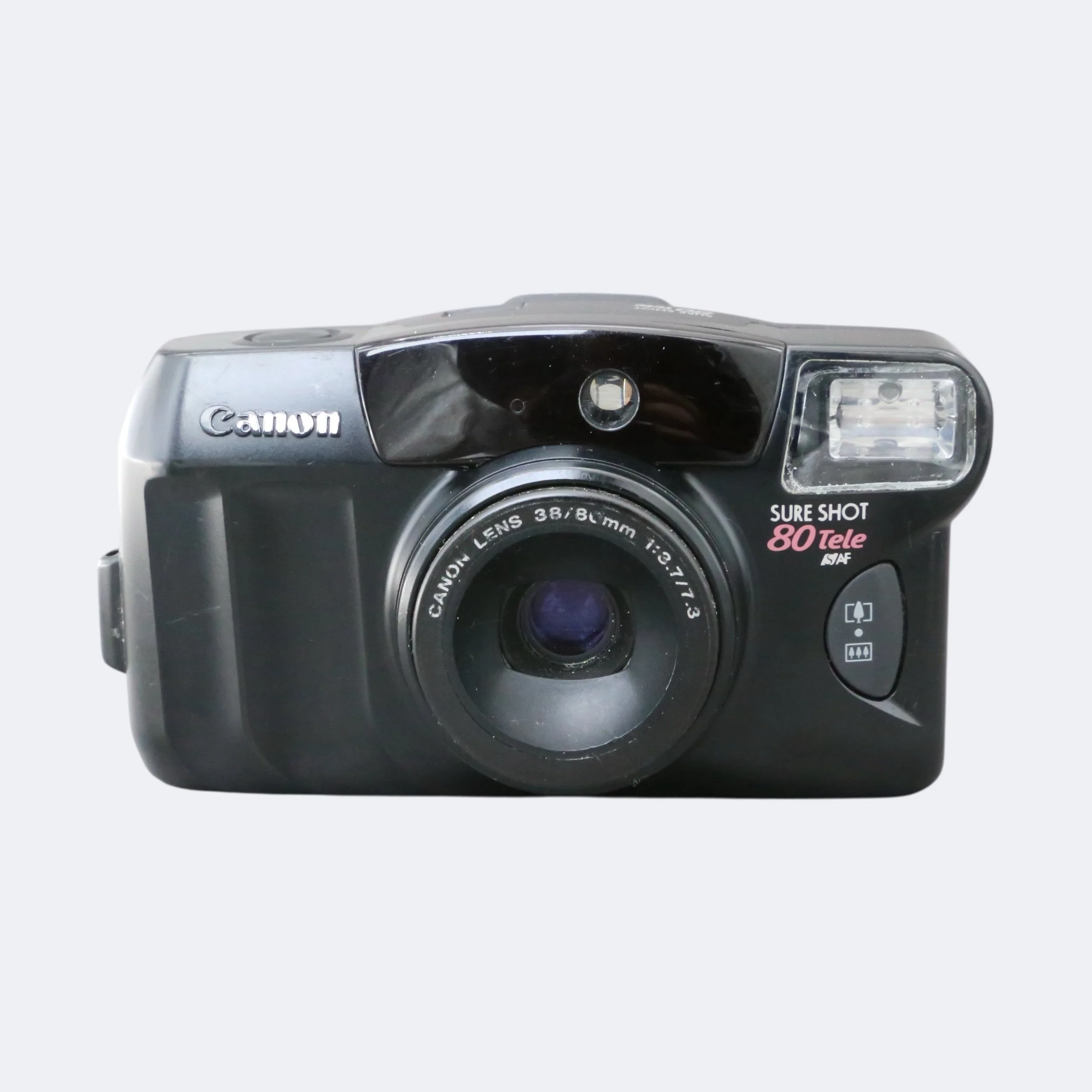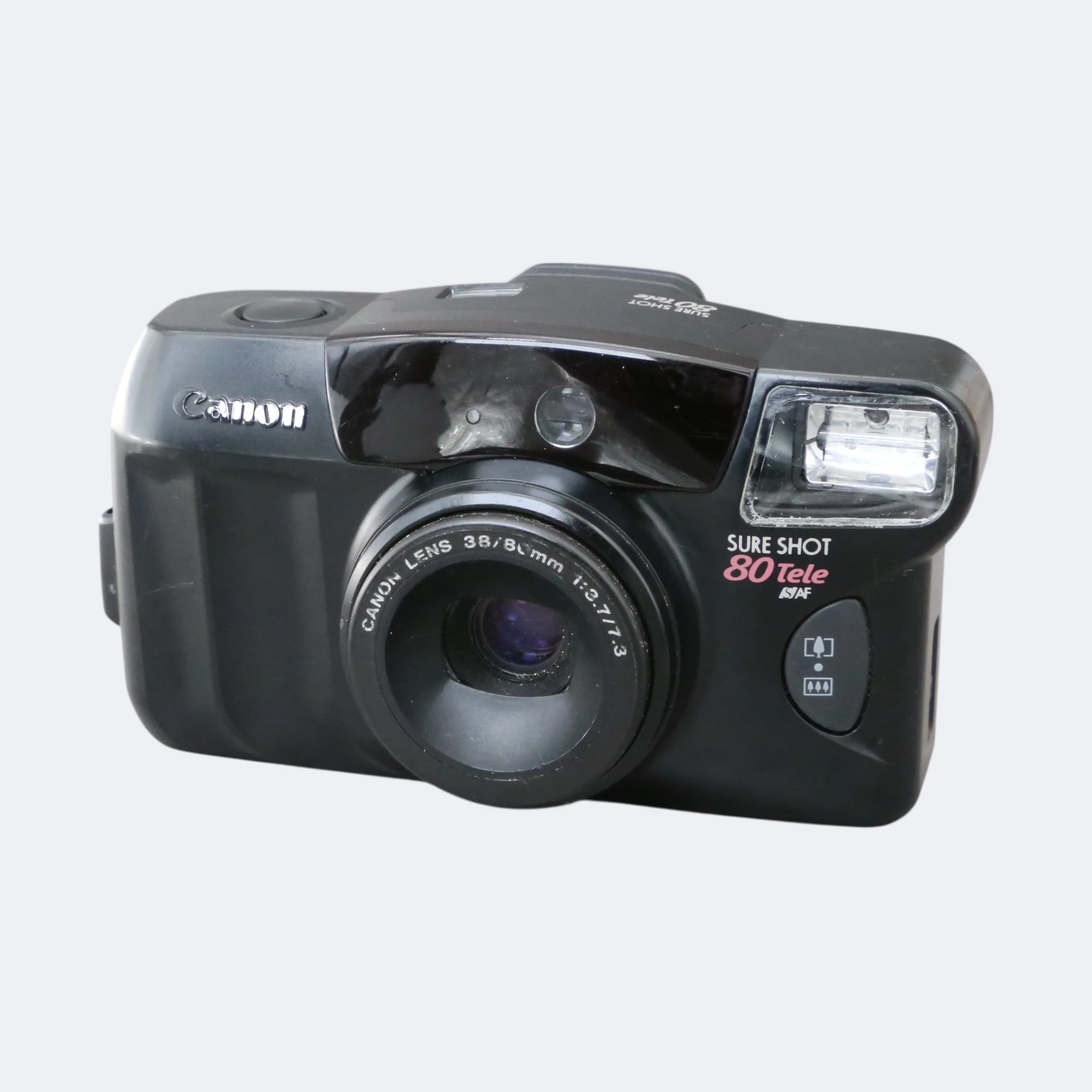 A versatile dual focal length point-and-shoot from the 1990s, the Canon Sure Shot 80 TELE features a switchable 38mm wide and 80mm telephoto lens. Compact and easy to use, it’s a great choice for casual film shooters who want classic Canon reliability with a simple zoom option.