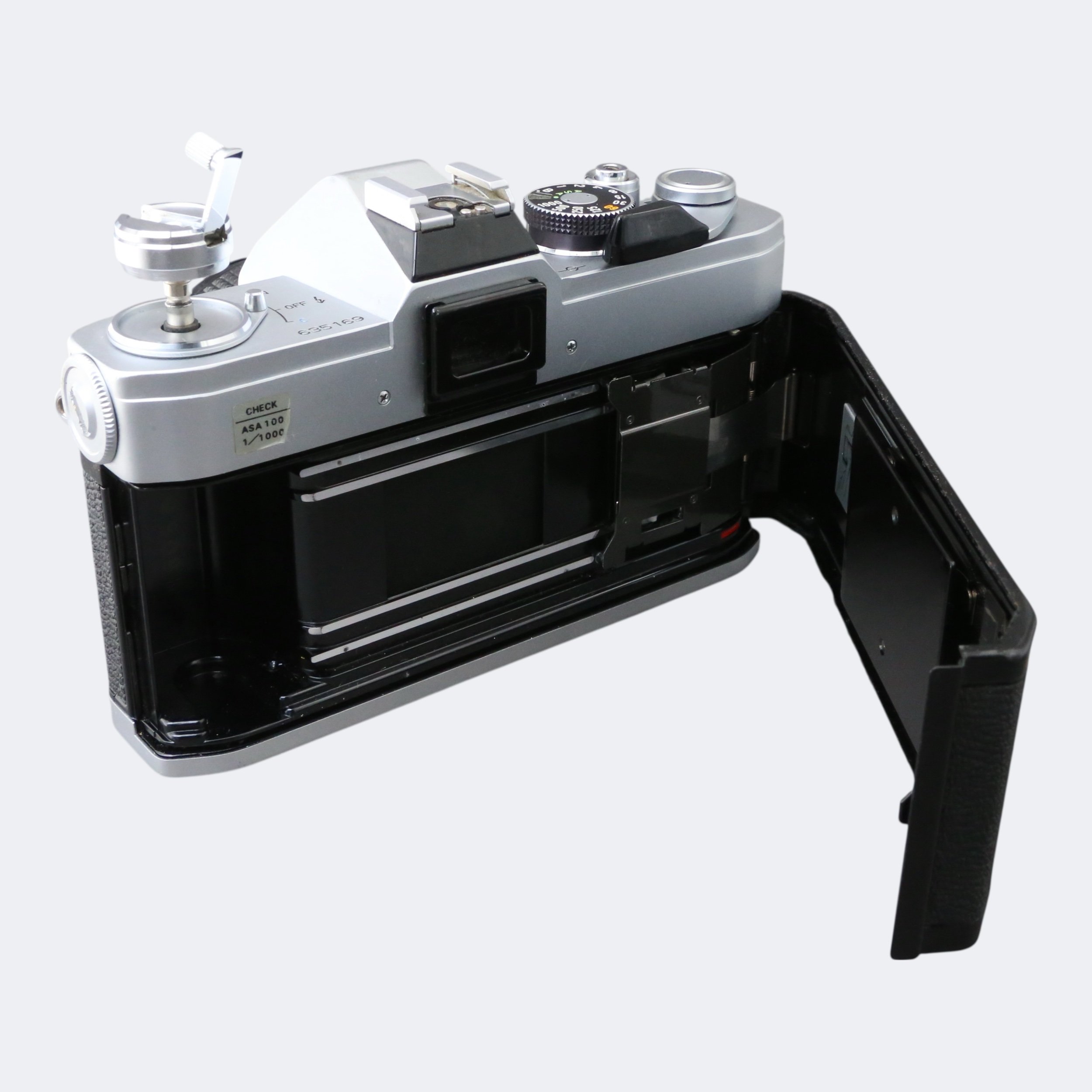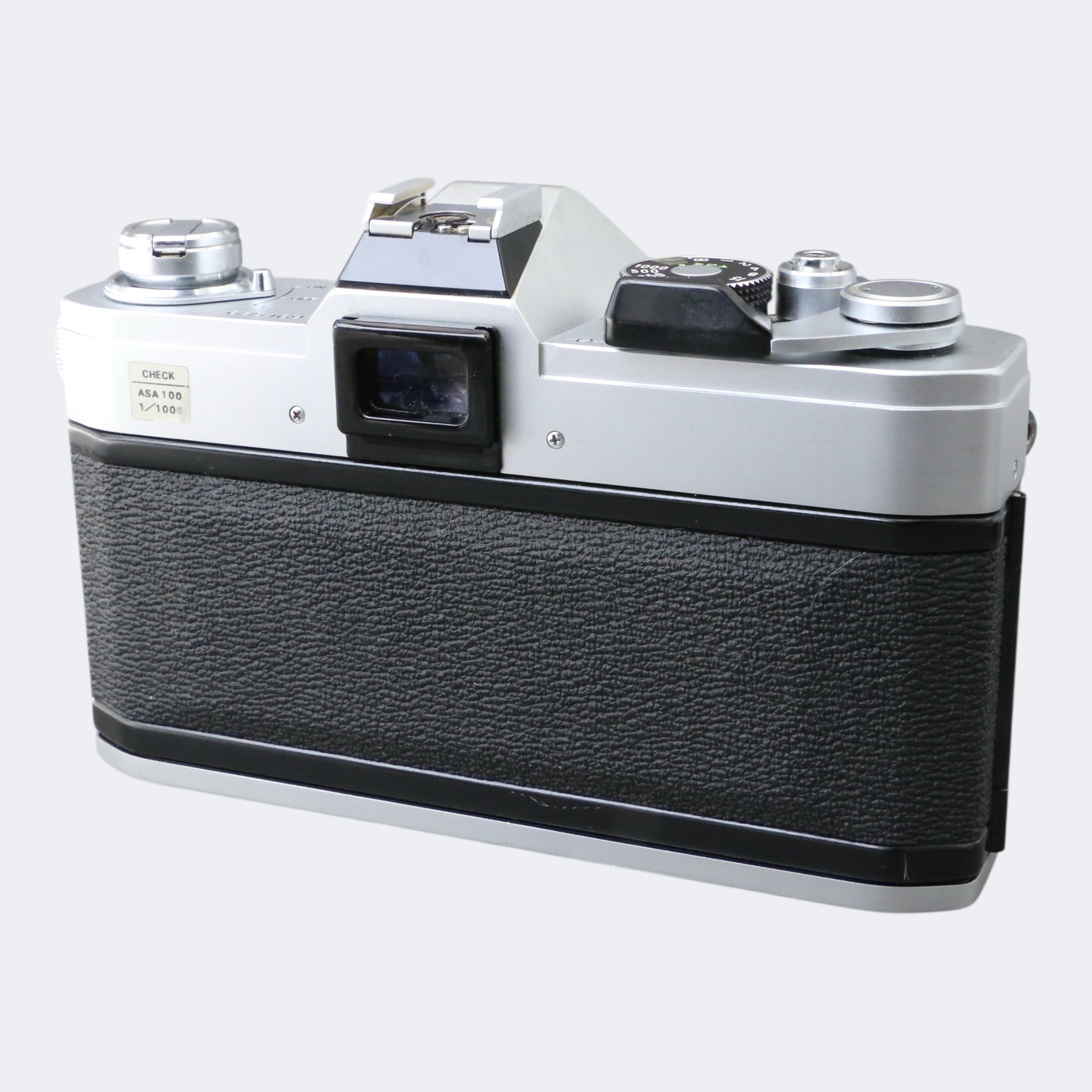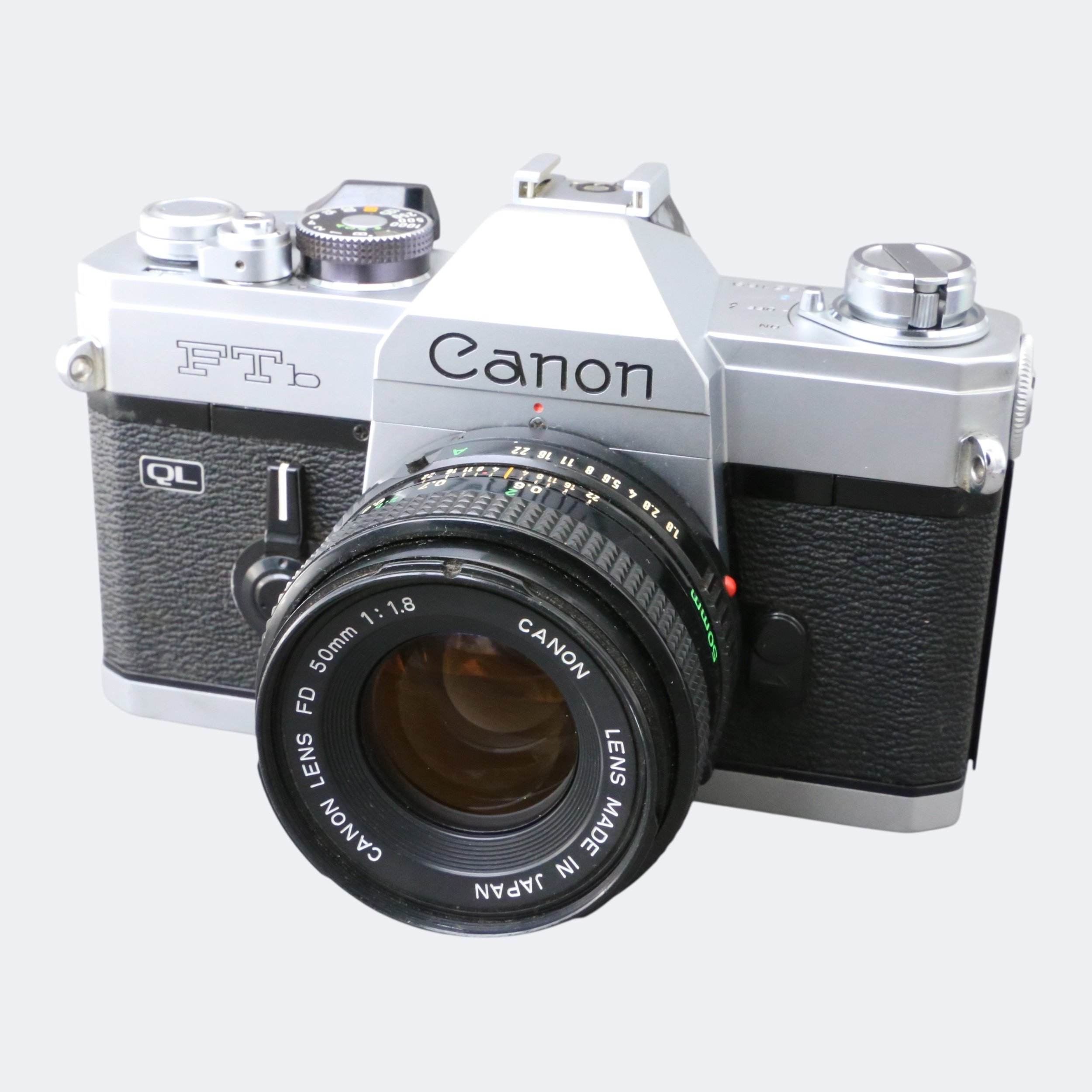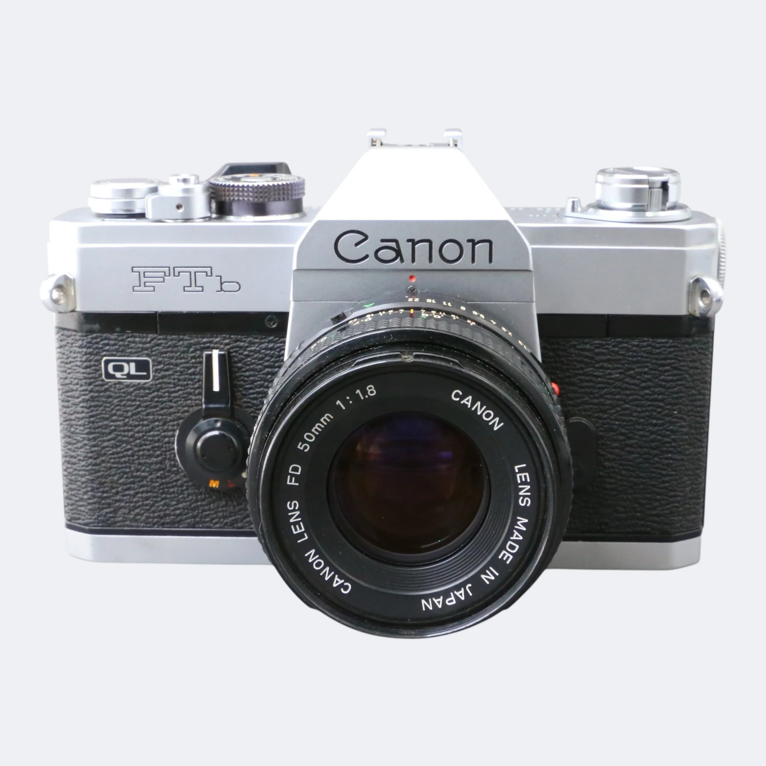 A rugged, all-metal SLR from the early 1970s, the Canon FTB is known for its reliability, precise manual controls, and classic mechanical design. Paired with the Canon FD 50mm f/1.8 lens, this setup is ideal for portraits, street photography, and photographers learning full manual exposure.